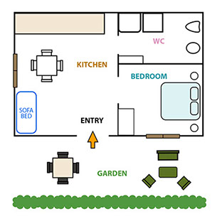 Il bilocale di circa 40 mq è posizionato al piano rialzato di un fabbricato rurale con ingresso indipendente e ampi spazi esterni ed è così composto: Ingresso, cucina abitabile-living con tavolo da pranzo e divano trasformabile in 1 posto letto, camera da letto matrimoniale e bagno. Dispone in totale di n.3 posti letto ed è dotato di: aria condizionata, riscaldamento, ampio parcheggio, frigo, forno, cucina a gas, piatti, stoviglie, pentole, tovaglie, biancheria, tv, asciugacapelli, ferro da stiro e lavatrice.